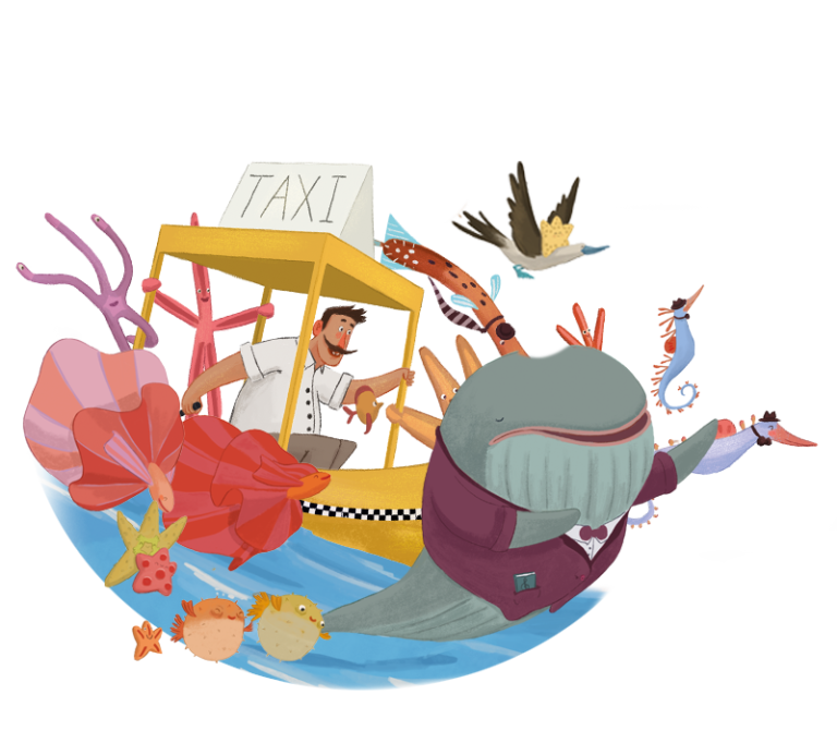 Go on a seek-and-find adventure to search high and low for little hints and clues to discover what is being left behind in the taxi! Would you like a little tip? (Look closely inside Mr. Taxi’s taxi on the pages where the animals jump into the sea!)
